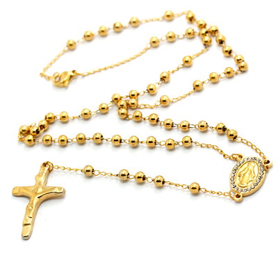 Pozlacený katolický růženec z nerezové oceli.